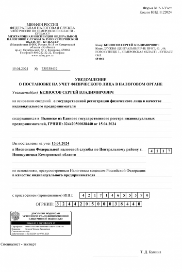 ОГРН 324420500038440 ИП Безносов С. В.